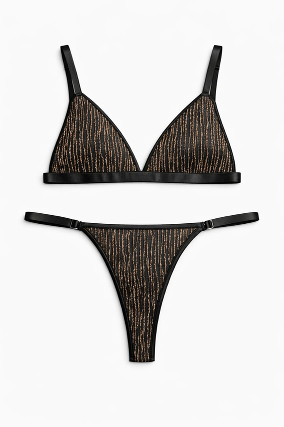 Conjunto de corpiño triángulo y microbikini confeccionado en textiles con brillo. Súper sexy, cómodo y trendy, ideal para destacar tu figura y brillar ¡Animate a lucir única!